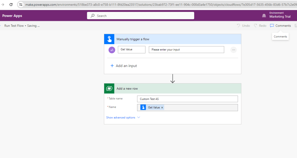 So below is a sample Power Automate which i created to showcase this. I created a Instant flow “Run Test Flow” with Input Parameter ”Get Value” and then we will use this value to create a record in table “Custom Test A”