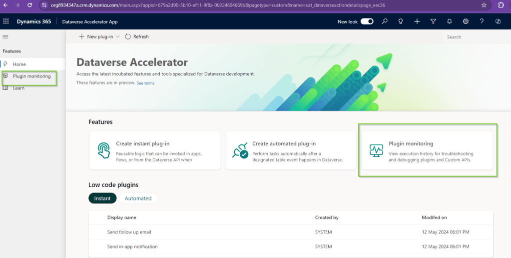 I was exploring the Dataverse Accelerator App, and I came across this preview feature which explains about the plugin monitoring through Dataverse Accelerator App.